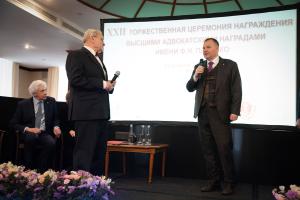 Для открытия церемонии на сцену были приглашены сопредседатели Комитета по награждению адвокатскими наградами им. Ф.Н. Плевако – вице-президент ФПА РФ, президент Адвокатской палаты Московской области Алексей Галоганов и председатель Комиссии Совета ФПА РФ по защите прав адвокатов, первый вице-президент Адвокатской палаты города Москвы Генри Резник.